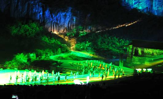 《印象.武隆》是张艺谋创作团队在武隆独有的喀斯特地貌之上,借助现代舞台光效,打造的大型情景剧演出,整台演出精彩不断,让人如身临其境。之后,肖院长、梁娜、马爱军等一行与2011级、2012级在此实习实践的即将毕业的同学进行了座谈,肖院长对同学们在《印象武隆》中的精彩表现给予了肯定,他表示:《印象 武隆》是武隆风光与特色文化浓缩而成的一部高水准的艺术盛宴,他表现了巴蜀人隐忍、坚韧、不辞辛苦、团结协作,在险境中顽强、乐观、豁达的意志,希望同学们学习这种精神,同时在表演中不断提高艺术修养,追求更高的艺术目标。