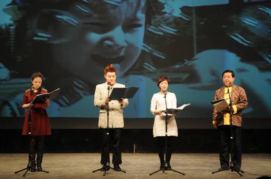 演出在《盛世中国》的诗歌朗诵中拉开了帷幕。我院优秀毕业生鲁阳、李彦妮及影视系青年教师杨登峰、许海帆联袂表演,他们铿锵有力、饱含深情的朗诵表达了对中国共产党、对伟大的社会主义祖国的无比热爱之情。