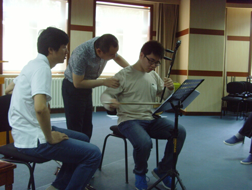 韩小青(左二)指导民乐系板胡研究生王猛同学“搂弦”技巧