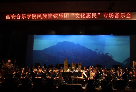 12月17日下午,西安音乐学院民族管弦乐团来我院举办了民族管弦乐团“文化惠民”专场音乐会,参加演出的是西安音乐学院优秀的青年教师和学生。我院院长刘胜辉,教务处处长李旭阳、招就处处长朱志清、器乐系主任韩小青以及西安音乐学院民乐系党总支书记张津波、民乐系副主任呼延梅文、高小鹏、民族管弦乐团团长赵鸿宾等到场观看演出。