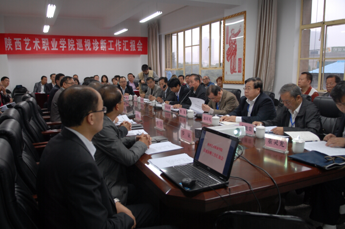 院长刘胜辉对巡视诊断自查工作做了汇报。他从我院的基本情况、办学成效、今后的发展思路及存在的问题等4个方面介绍了学院的建设与发展情况。他讲到,2010年,省委、省政府为加快陕西“文化强省”建设,完善艺术类高职教育层次,根据陕西文化大省对应用型、技术型艺术人才需求的实际,决定合并组建成立陕西艺术职业学院。经过3年多的艰辛努力,学院完成了筹建工作,并逐步完善了各项管理制度,形成了特色显明的专业体系和结构较合理的教师队伍,同时,以教学为中心,强化实习实训,注重学生全面健康成长和人才质量培养,依据“特色求生存、质量求发展”的办学思路,向成为陕西省文化艺术人才培养基地不断跨越和提升。同时也指出在新校区建设、师资引进、教学条件等方面存在的突出问题等。他表示希望通过巡视诊断,进一步理清学院发展的思路,提出适合我院发展的“一校一策”,进一步提高学院的办学质量和水平。