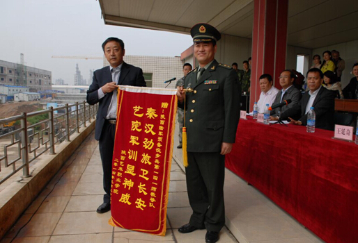 党委书记王延奇代表学院为第一四一师教导队赠送锦旗,对为我院学生军训的全体官兵致以诚挚的感谢和崇高的敬意。