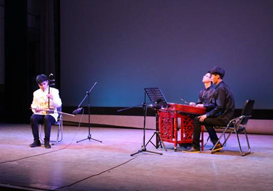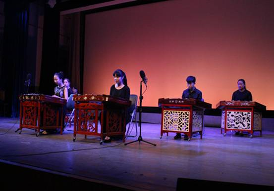 音乐会首先在扬琴的齐奏声中拉开帷幕,一首《喜讯》让观众们精神振奋,激情昂扬。《十面埋伏》是一首著名的琵琶独奏曲,汇集了琵琶几乎所有的技法和技术,是一首有较高难度的独奏曲。我系学生徐佳璐以高超的技术和良好的乐感完美的演绎了此曲。大弦嘈嘈如急雨,小弦切切如私语。嘈嘈切切错杂弹,大珠小珠落玉盘!完美的给我们展现了楚汉之争,项羽兵败垓下,拔剑自刎的历史场景。听后使人身临其境,感叹命运的蹉跎。铿锵的琵琶武曲结束后是一首柔美的古筝二重奏。《拔根芦柴花》是一首有名的江苏民歌,流传大江南北。根据此曲改编的古筝二重奏优美动听,发挥了古筝委婉抒情的特点,又继承了民歌的旋律素材,两者完美的结合使听众大饱耳福。接下来是笛子独奏曲《走进快活岭》。此曲由山东籍的著名笛子演奏家曲详作曲,有着浓郁的山东民间音乐特点。乐曲轻快活波,描写了人们战神艰难险阻终于抵达快活岭的欢乐心情,表达了苦尽甘来,先忧后乐的哲学思想。二胡曲《曲江吟》是由著名音乐家鲁日融先生创作的经典曲目,此曲以陕西地方戏曲碗碗腔和眉户音乐为素材,吸收了戏曲音乐中的板式特点,吟唱了世间的哀怨,感怀人情的悲愤,乐曲时而激昂,时而舒缓,带领听众一起感受历史的沧桑,人情的冷暖。