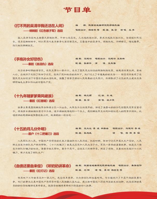 本次演唱会由陕西艺术职业学院戏曲系师生,学院合唱团和民族管弦乐团担纲演出,通过师生同台表演,追忆难忘革命岁月,唱响新时代奋斗精神,为纪念党的十一届三中全会胜利召开暨改革开放40周年献礼。