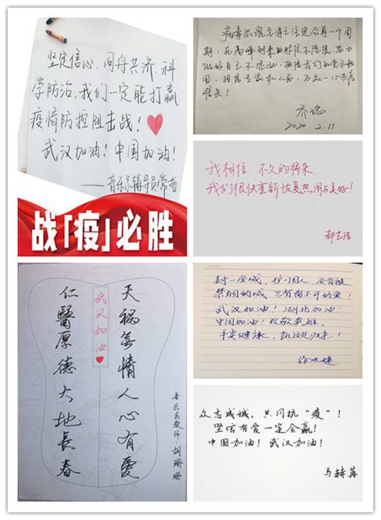 面对突如其来的新冠肺炎疫情,全国上下众志成城,坚决打赢疫情防控阻击战。近日,音乐系直属党支部组织系部师生开展“心语”接力,师生在家自觉阻断疫情的同时,纷纷通过书法、绘画、歌曲创作、海报、视频等,用暖心、朴实的话语,接力为奋战在一线的战“疫”英雄和白衣天使们加油,祈福武汉平安、中国平安,早日战胜疫情!