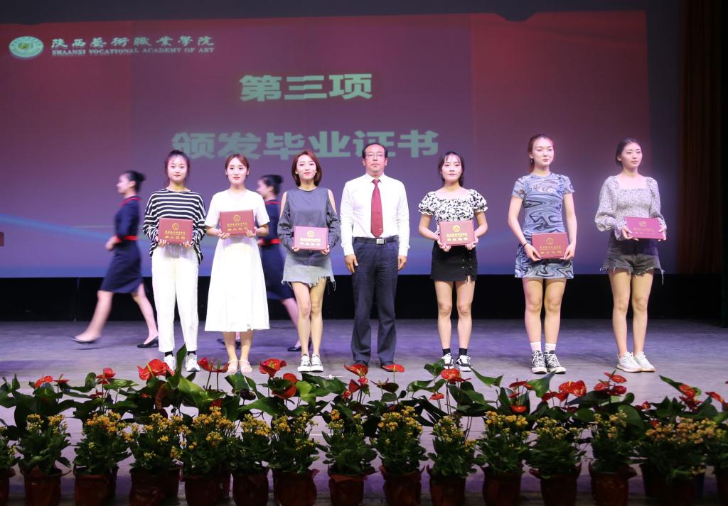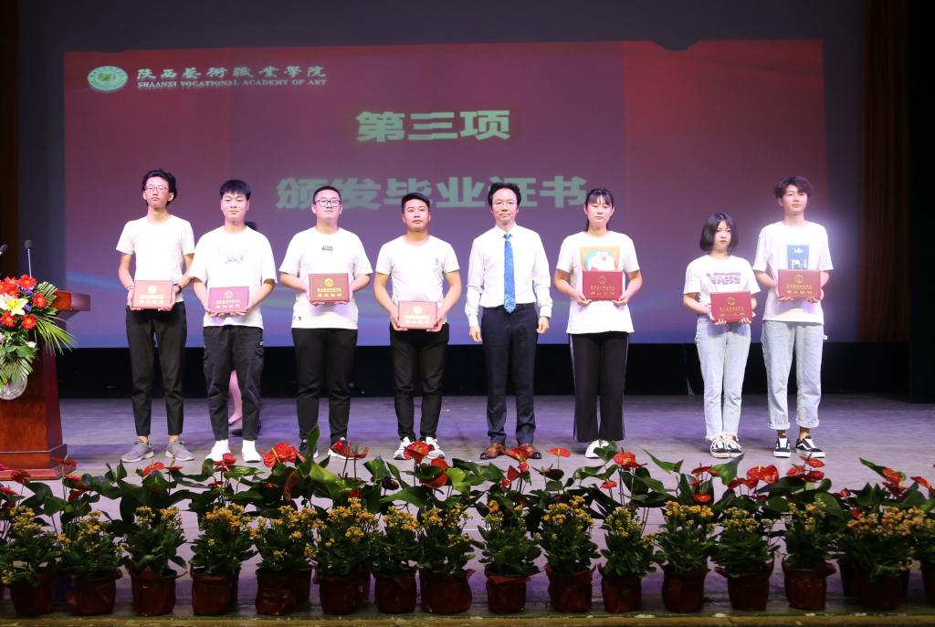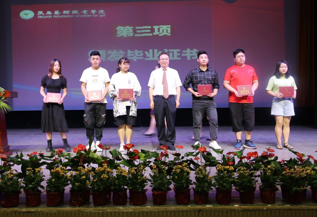 任玉银宣读了《陕西艺术职业学院关于 2020年戚顺等873名高职学生准予毕业的决定》《陕西艺术职业学院关于 2020年党汉等247名中职学生准予毕业的决定》。全体院领导为优秀毕业生代表颁发了毕业证。