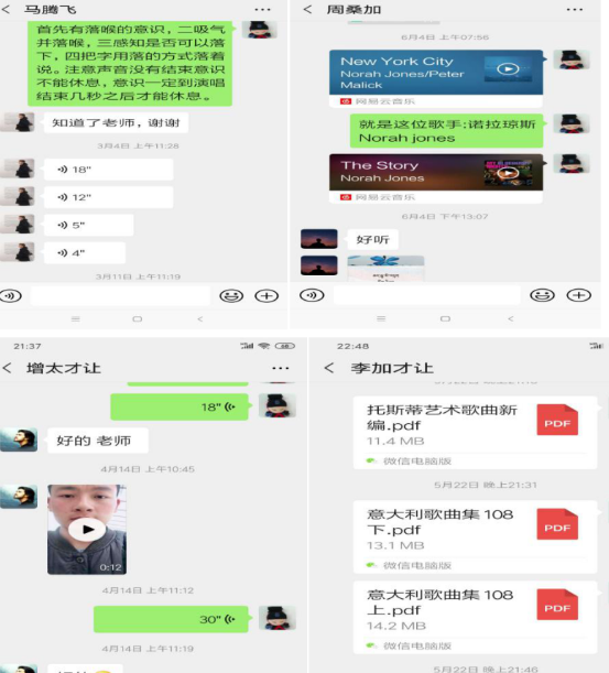在课后教学反馈与答疑中,我通过微信、QQ平台,把线下五十分钟的课程,变成了师生随时发送视频、语音等文件进行交流指导的全天候课程,让学生在课后练习中出现的问题及时得到指导和修正,极大地提高了学生的学习效率和学习热情。其次,我还通过发送著名歌唱家演唱视频,引导学生观摩、欣赏学习,从而使学生更深地理解和巩固了歌唱技术,拓展了声乐知识,提升了音乐艺术审美,强化了学生的职业素养。
