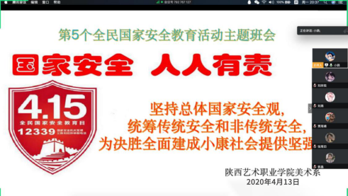 【美术系】美术系召开“全民国家安全教育日”主题“云”班会。会议通过“国家安全教育PPT讲解”“视频教育”“案例分析”三部分有序进行。会议指出,国家安全不是遥远的“谍战片”,而是与我们每个人、每个家庭息息相关、近在咫尺,在维护国家安全上人人都不是局外人,人人有责,人人都需尽责。美术系直属党支部书记马爱军会上希望同学们以“全民国家安全教育日”为契机,增强国家主人翁意识,时刻谨记“国家安全,有关你我”,坚决维护国家利益。之外,该系还通过班级群内转发国家安全相关学习资料和视频,在学生朋友圈发起“国家安全 有关你我”接力活动等广泛宣传国家安全知识。