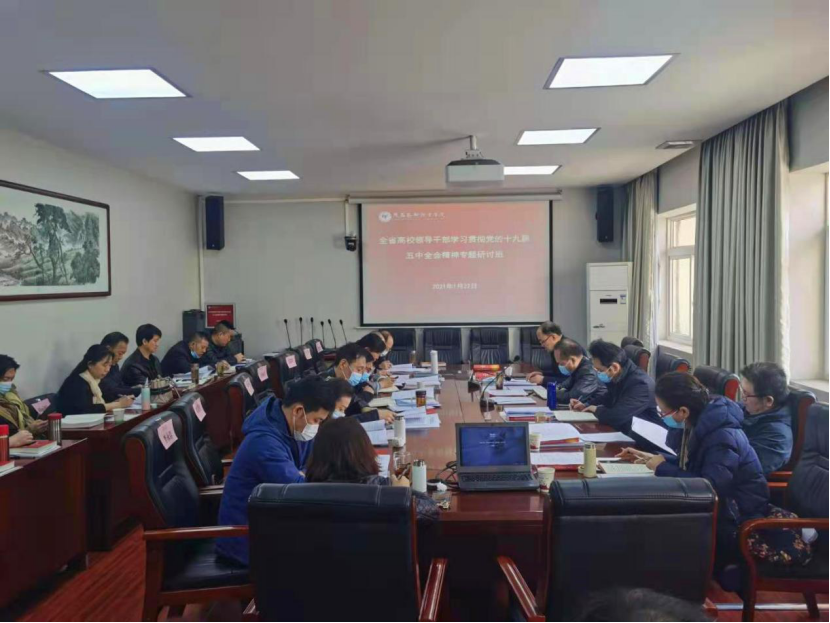 1月27日至29日,全省高校领导干部学习贯彻党的十九届五中全会精神专题研讨班举办。省委教育工委书记王建利作动员讲话,省委教育工委副书记陈乃霞主持开班仪式。我院在文艺南路校区五楼会议室以视频会议的形式参加专题学习。院党委书记刘正利,党委副书记、院长杨孝龙及其他院领导班子成员,各处室、各系部负责人等共37人参加了专题研讨班。