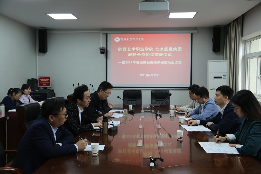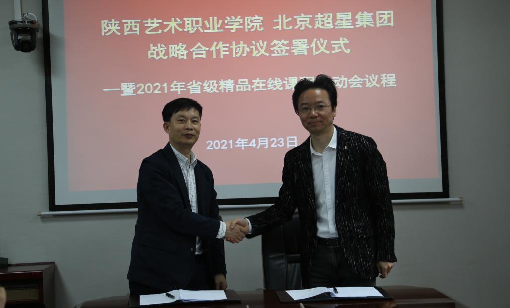 4月23日,陕西艺术职业学院与北京超星集团战略合作协议签署仪式在文艺南路校区五楼会议室举行。陕西艺术职业学院院长杨孝龙与超星集团副总经理兼西安分公司总经理谢柯代表双方单位签署合作协议。超星集团西安分公司行业副总经理许增平、项目经理孟超 、课程运营负责人陈兴英与我院副院长任玉银、党政办公室主任许仲举、教务处处长马琳及各系负责人出席仪式。仪式由马琳主持。