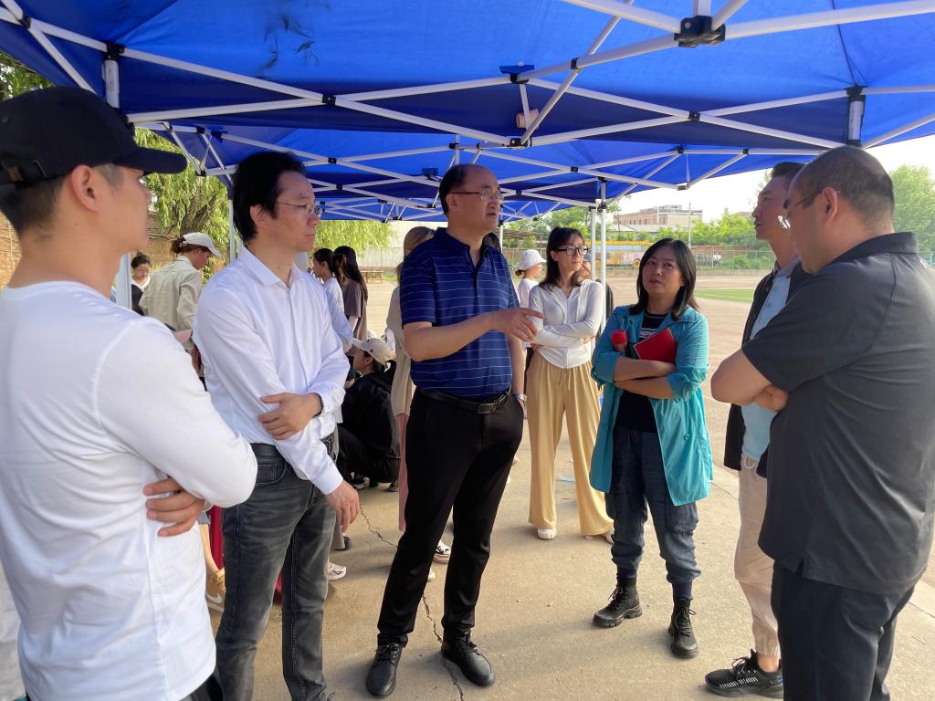 在排练现场,组委会导演组指导老师向杨孝龙一行介绍了我院学生训练情况,对我院学生洒汗水、勇拼搏的良好精神面貌给予充分肯定。