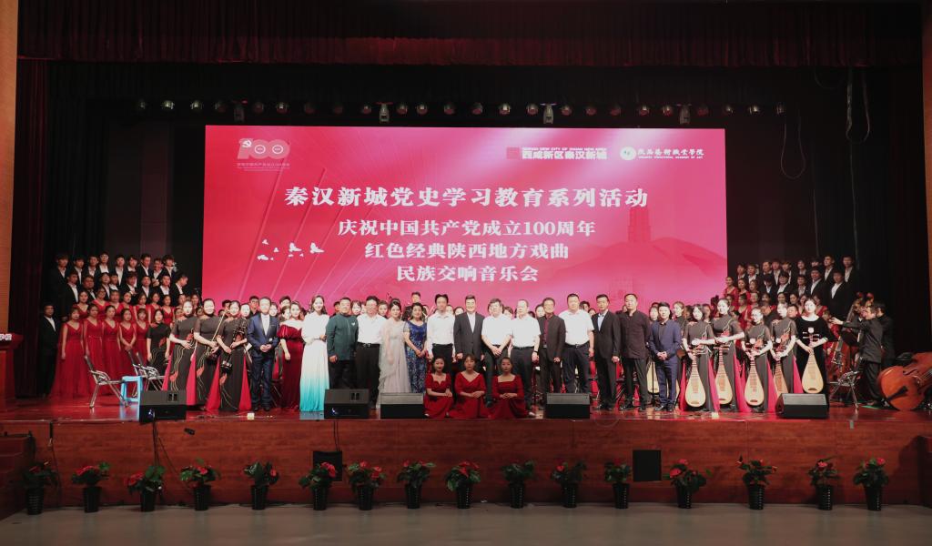 6月23日,由西咸新区秦汉新城管委会主办、陕西艺术职业学院师生担纲演出的红色经典陕西地方戏曲民族交响音乐会在秦汉中学大礼堂精彩上演,献礼建党百年。秦汉新城党委副书记吴起、院党委书记刘正利先后为音乐会致辞。院党委副书记、院长杨孝龙,秦汉新城党委委员、管委会副主任杨占成,院党委委员、副院长任玉银、邵鸣与秦汉新城管委会各单位、各部门干部员工、各街办党员、秦汉中学师生代表等一起观看了演出。