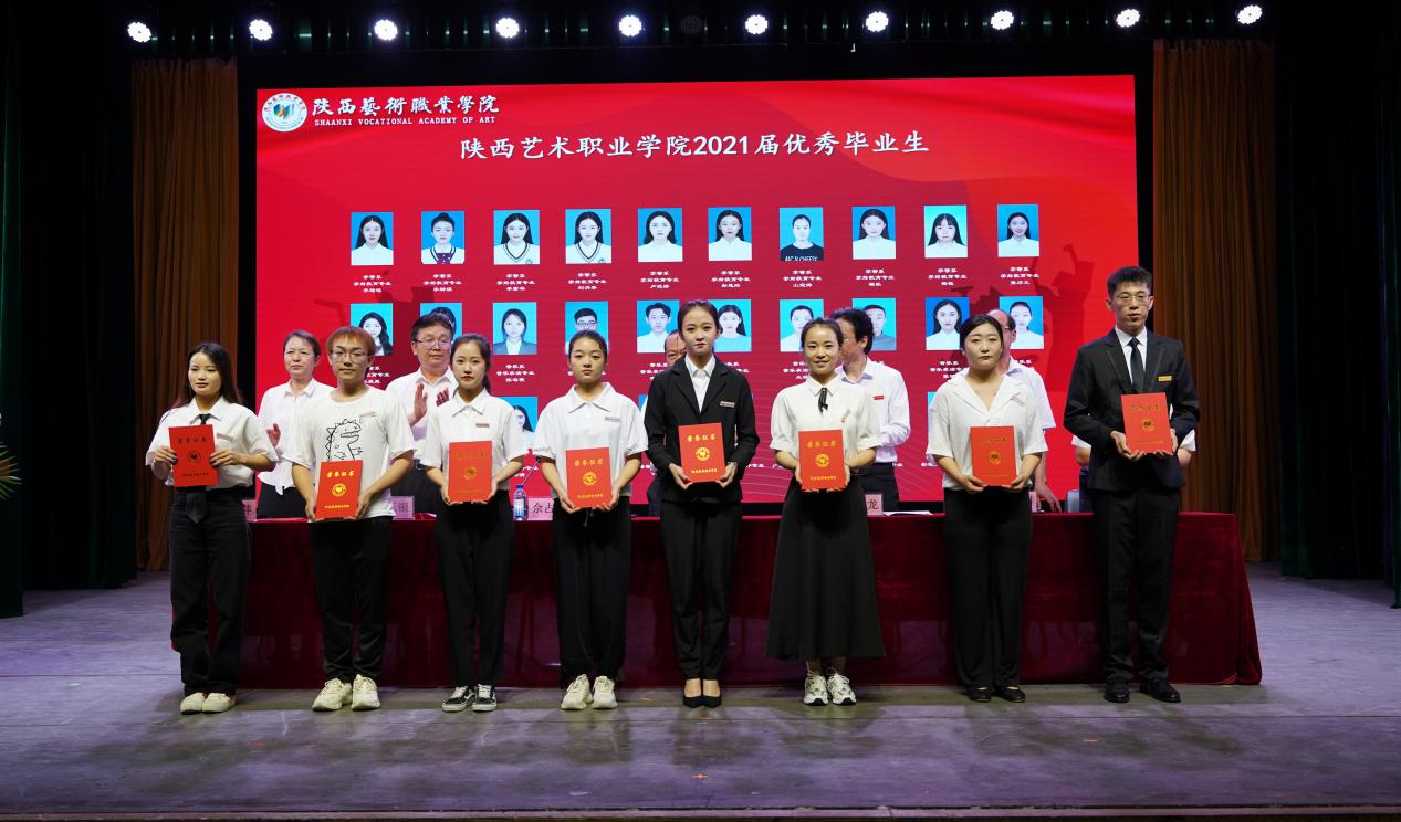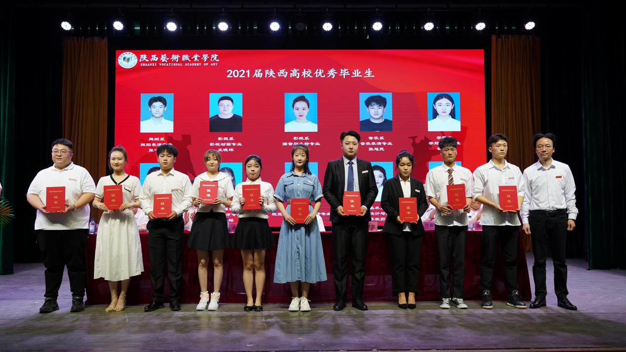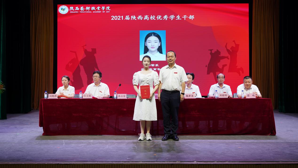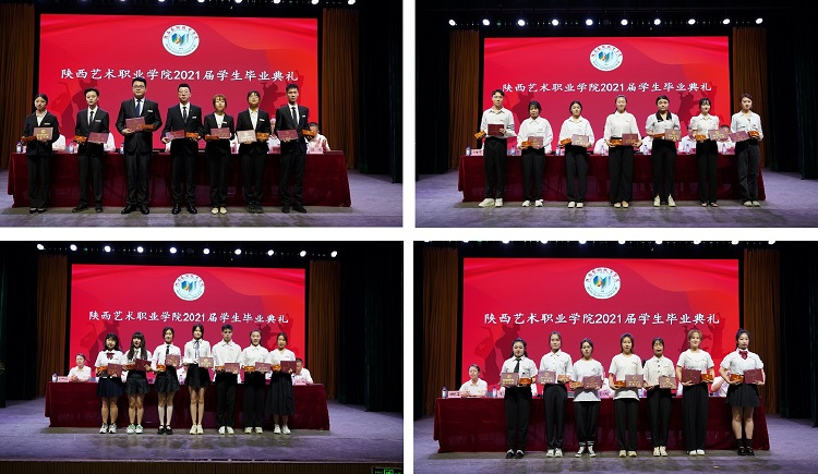 佘占宏宣读陕西省教育厅《关于表彰2021届陕西高校优秀毕业生和优秀学生干部的通报》《陕西艺术职业学院关于表彰2021届优秀毕业生的决定》。院领导分别为荣获省级“优秀学生干部”、省级“优秀毕业生”、院级“优秀毕业生”称号学生颁发荣誉证书。