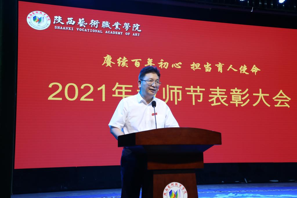 奏唱国歌后,邵鸣宣读了《关于表彰“光荣在教30年”人员的决定》《陕西省教育厅关于表彰第十二届陕西高职院校教学名师奖获奖教师的通知》《文化和旅游部办公厅关于通报表扬百名优秀戏曲专业专兼职教师的通知》《关于表彰陕西艺术职业学院第一届教学名师的决定》《关于表彰2021年度优秀教师、优秀教育工作者、优秀辅导员(班主任)的决定》。随后,院领导依次为各类受表彰教师颁发荣誉证书,学生代表向各位受表彰老师献花。