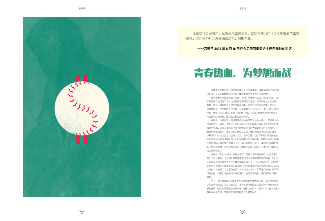 本期《电影画刊》以习近平总书记关于体育的重要论述为指导,选取近年来国内、国外体育电影中突出“励志、热血、强共情”等题材优势,涵盖鼓舞、团结、超越自我等昂扬精神内核的优秀影片进行推介,力求做到思想性、艺术性、欣赏性俱佳,真正发挥文艺的社会价值。