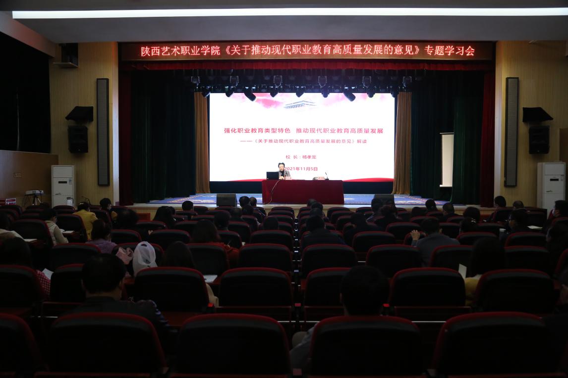 11月5日,陕西艺术职业学院在文艺南路小剧场召开党委理论学习中心组(扩大)学习会。党委副书记、校长杨孝龙专题解读《关于推动现代职业教育高质量发展的意见》。校党委委员、副科级以上干部参会。