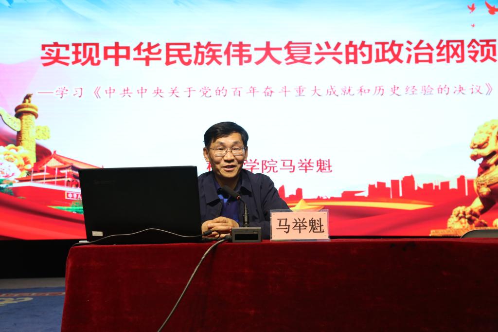 省委教育工委、省教育厅党的十九届六中全会精神宣讲团成员、榆林学院红色文化研究与传承中心主任马举魁教授作报告