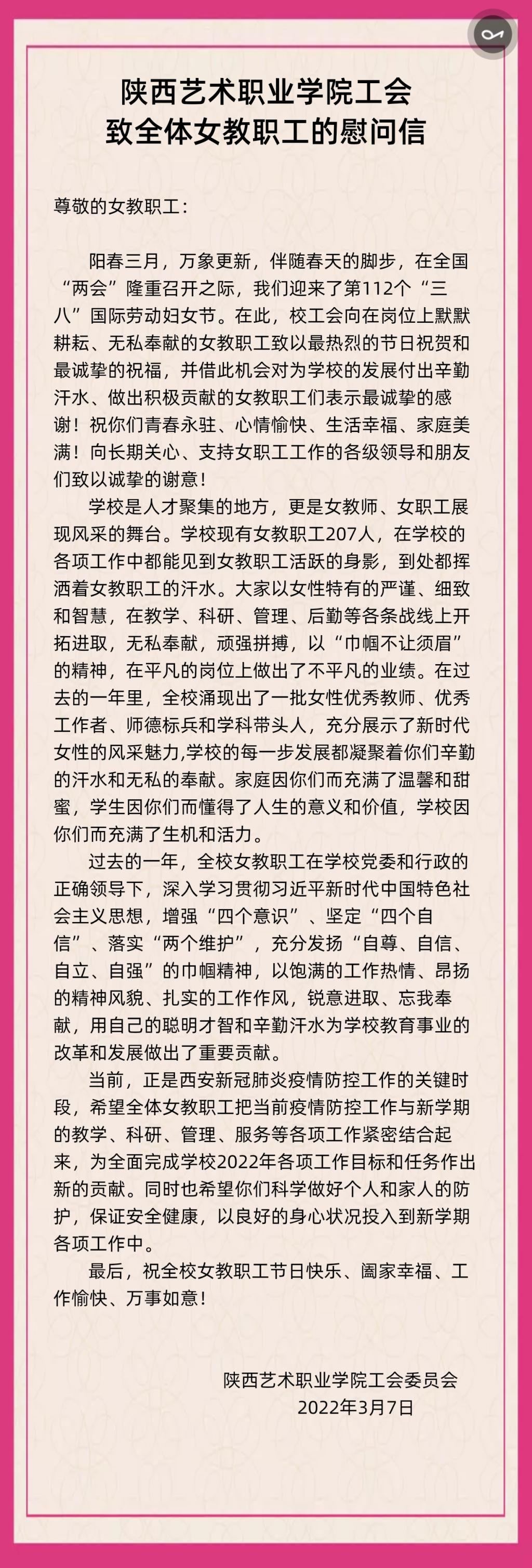 陕西艺术职业学院工会致全体女教职工的慰问信
