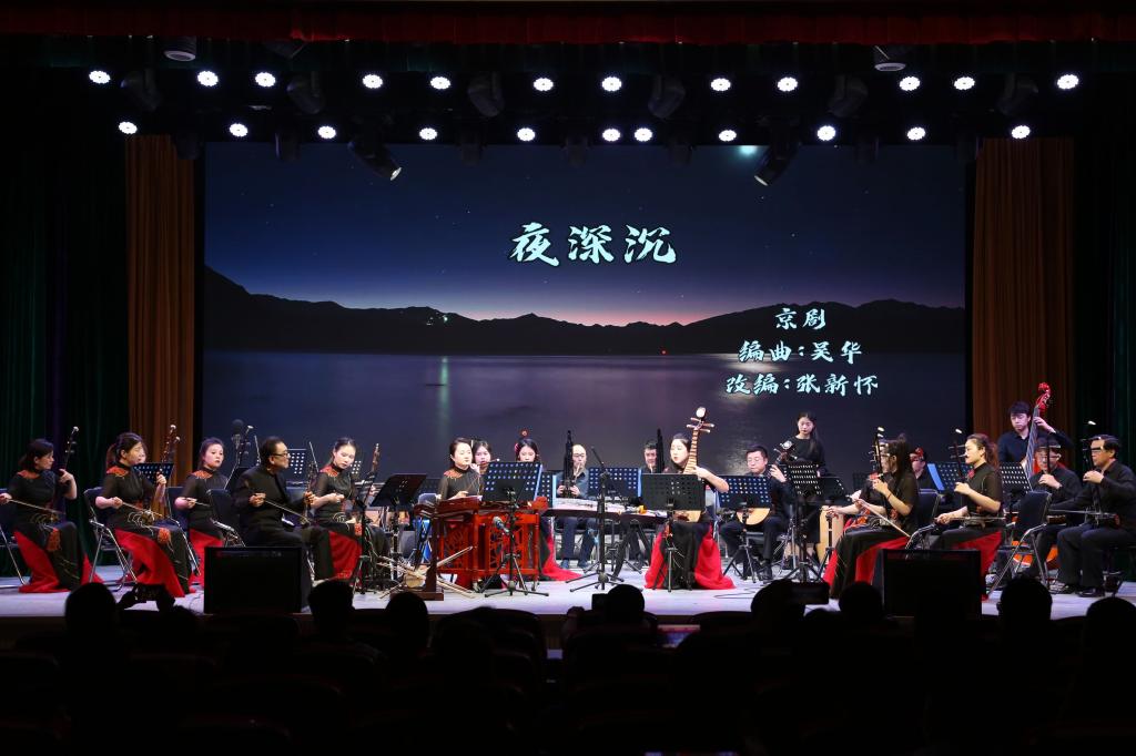 音乐会在《秦风戏韵》中拉开帷幕,板胡、二胡、琵琶、扬琴、古筝、阮、笙、竹笛等十余种民族乐器奏响宏伟壮阔、激情飞扬的乐曲,生动展现盛世中华的山河壮美,三秦儿女的幸福祥和。《丝路欢歌》、阿宫腔《秦声国风》、眉户《秦川情韵》、碗碗腔《华州新韵》、合阳线腔音乐《线戏新曲》……一首首具有浓郁陕西地方风格特色的民族乐曲,让观众充分领略陕西作为丝绸之路起点的深厚文化底蕴。驼铃阵阵,羌笛悠悠,换了音符……《河西走廊》《天山之舞》《西亚风情》在精彩的演奏中让观众穿越无垠的戈壁、茫茫的大漠、蜿蜒的山脉,沿着丝绸之路恣意昂扬,阔步前进,聆听“人类命运共同体”的强音,一步步将音乐会推向高潮。最后,由张新怀担任京胡演奏的《夜深沉》,大气典雅、荡气回肠。音乐会在经久不息的掌声中精彩落幕。