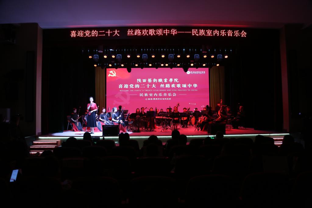 5月16日至17日晚,陕西艺术职业学院实验剧场众声交响、雅乐和鸣,“喜迎党的二十大 丝路欢歌颂中华”民族室内乐音乐会在这里精彩上演。校党委书记刘正利,党委副书记、校长杨孝龙,党委副书记、纪委书记郑毅刚,党委委员、副校长任玉银、马琳等与学校师生观看演出。