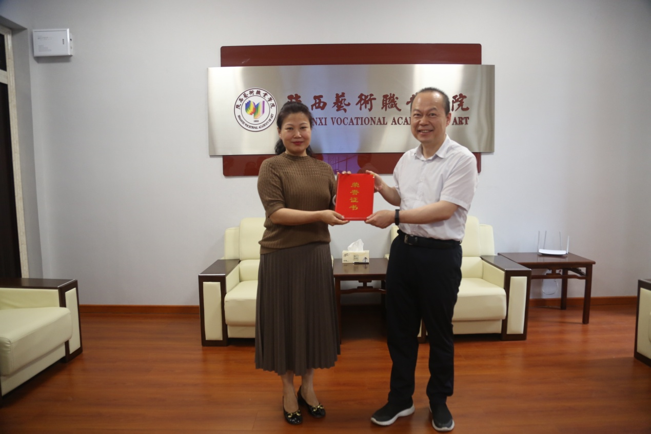 校党委书记刘正利分别为陕西省教科文卫体系统“五一巾帼标兵”称号获得者郝叶妮、梁少琴颁发荣誉证书