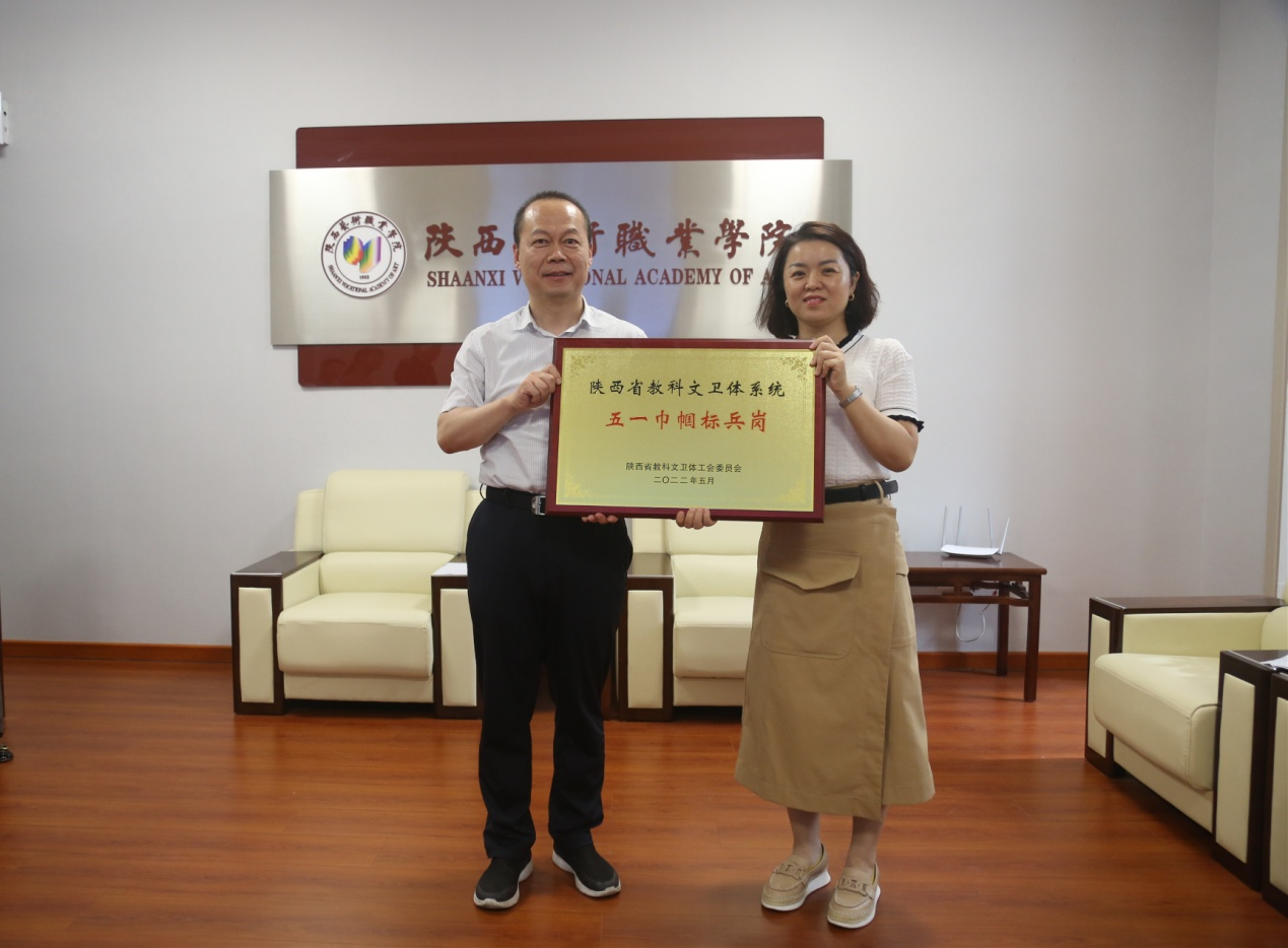 校党委书记刘正利为陕西省教科文卫体系统“五一巾帼”标兵岗荣誉获得集体财务处财务科颁发荣誉奖牌