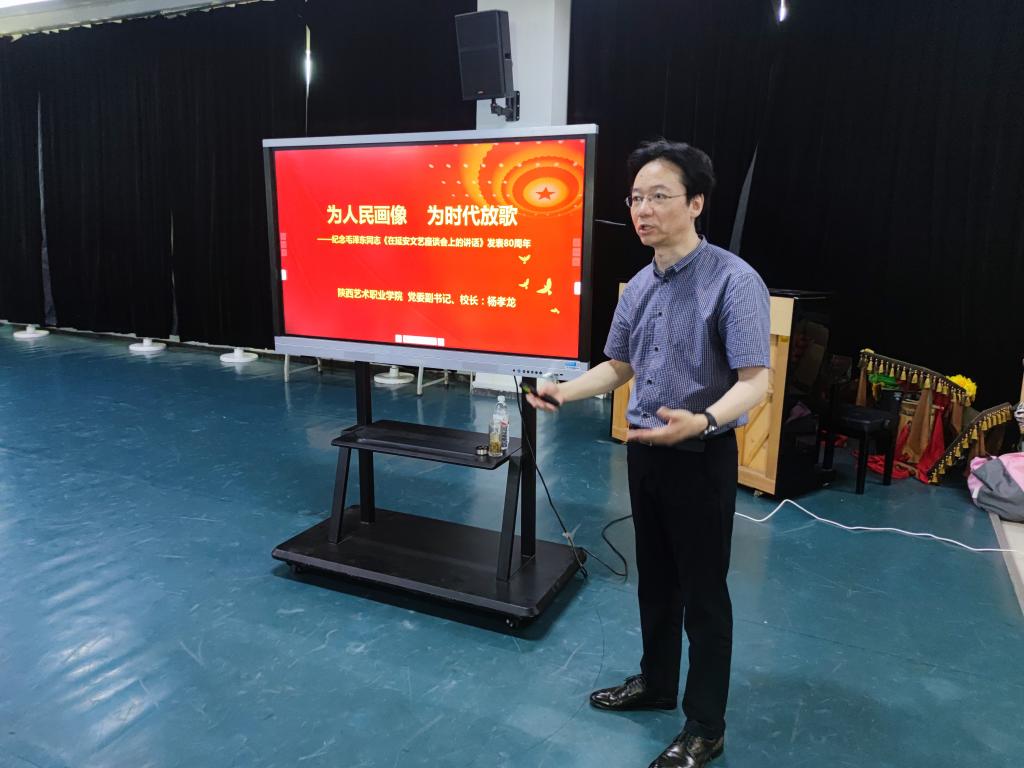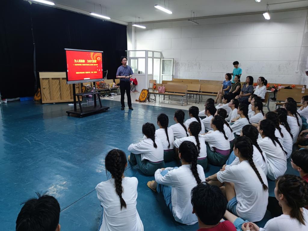 随后,杨孝龙结合原创舞蹈诗《天地歌(暂定名)》内容,向全剧参演师生讲授了题为“为人民画像 为时代放歌——纪念毛泽东同志《在延安文艺座谈会上的讲话》发表80周年”的专题思政课。杨孝龙以延安文艺座谈会召开的时代背景为切入点为广大学生深入浅出地介绍了毛泽东同志1942年《在延安文艺座谈会上的讲话》及习近平总书记2014年《在文艺工作座谈会上的讲话》的思想精髓。他表示,作为新时代艺术工作者,我们要与“人民同心”,与“时代同行”,与“民族同根”。随后,他着重介绍了著名美术教育家、当代人物画大师、黄土画派创始人刘文西的百米长卷《黄土地的主人》。他将长卷绘画内容与舞蹈诗表演内容相结合进行了生动讲解,以直观、易懂的方式对舞蹈表演过程中“‘器’‘身’‘心’”三者的关系进行了深刻阐释,让学生对舞剧的表演有了更深的认识。最后,他寄语同学们生逢伟大的时代,作为一名未来的艺术工作者,要向老一辈艺术家学习,坚持党的文艺方向,贯彻党的艺术方针,践行两个《讲话》精神,不负时代,不负韶华,在青春的赛道上,跑出加速度,跑出人生精彩。