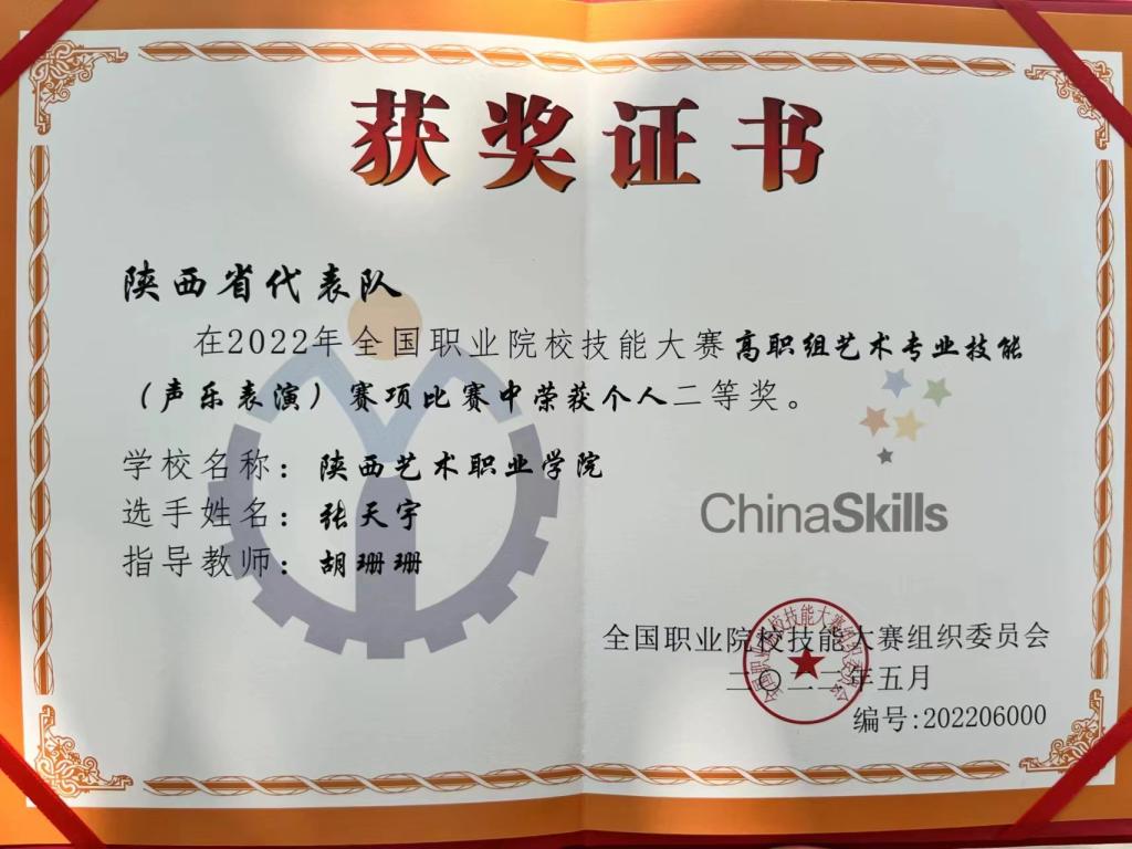 陕西艺术职业学院学生张天宇在2022年全国职业院校技能大赛“声乐表演”(高职组)中荣获二等奖