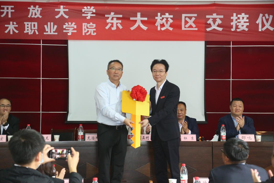 陕西开放大学党委副书记、校长龙治刚将代表东大校区的“金钥匙”交给陕西艺术职业学院党委副书记、校长杨孝龙