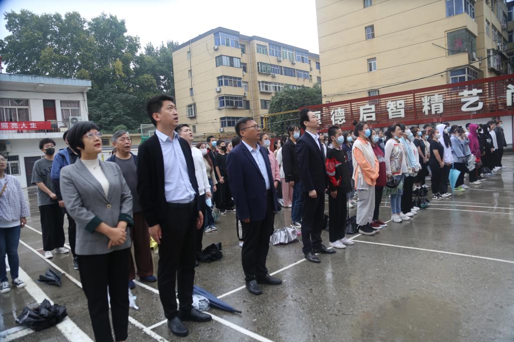 在绵绵秋雨中,升旗仪式在文艺南路校区庄严举行,伴随着《义勇军进行曲》铿锵的旋律,校领导们与师生雨中肃立,向国旗行注目礼,五星红旗冉冉升起,飘扬在校园上空。