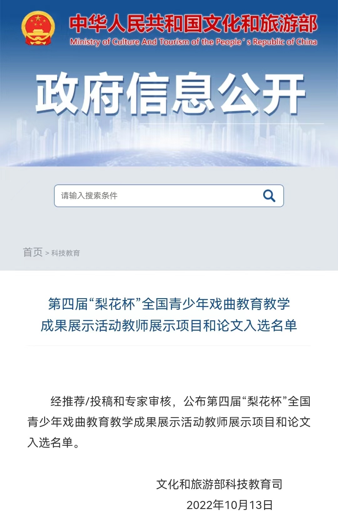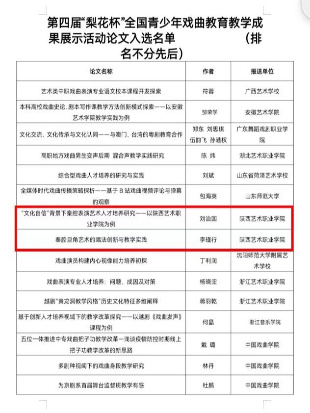 近日,第四届“梨花杯”全国青少年戏曲教育教学成果展示活动教师展示项目和论文入选名单公布。本次我校戏曲学院教师刘治国、李瑾行撰写的论文成功入选。