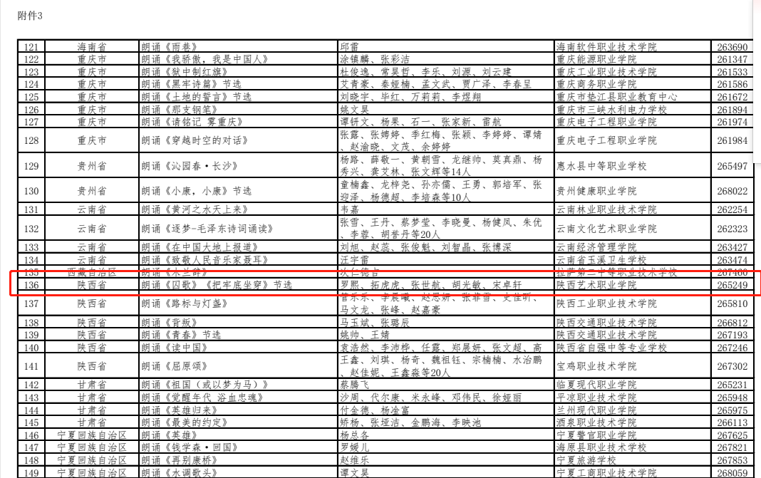 近日,第四届“诵读中国”经典诵读大赛陕西赛区发布获奖名单,由陕西艺术职业学院教师张轩铭、王普指导的朗诵作品:《我的自白书》节选(陈然)、《囚歌》节选(叶挺)、《把牢底坐穿》节选(何敬平)(参赛学生:影视传媒学院罗熙、拓虎虎、张世航、胡光敏、宋卓轩),荣获陕西赛区一等奖,并顺利进入全国总决赛(职业院校组)。