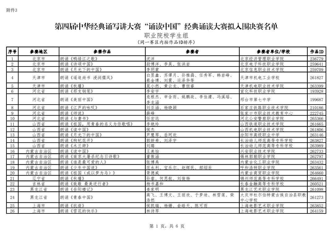 第四届“诵读中国”经典诵读大赛入围决赛名单