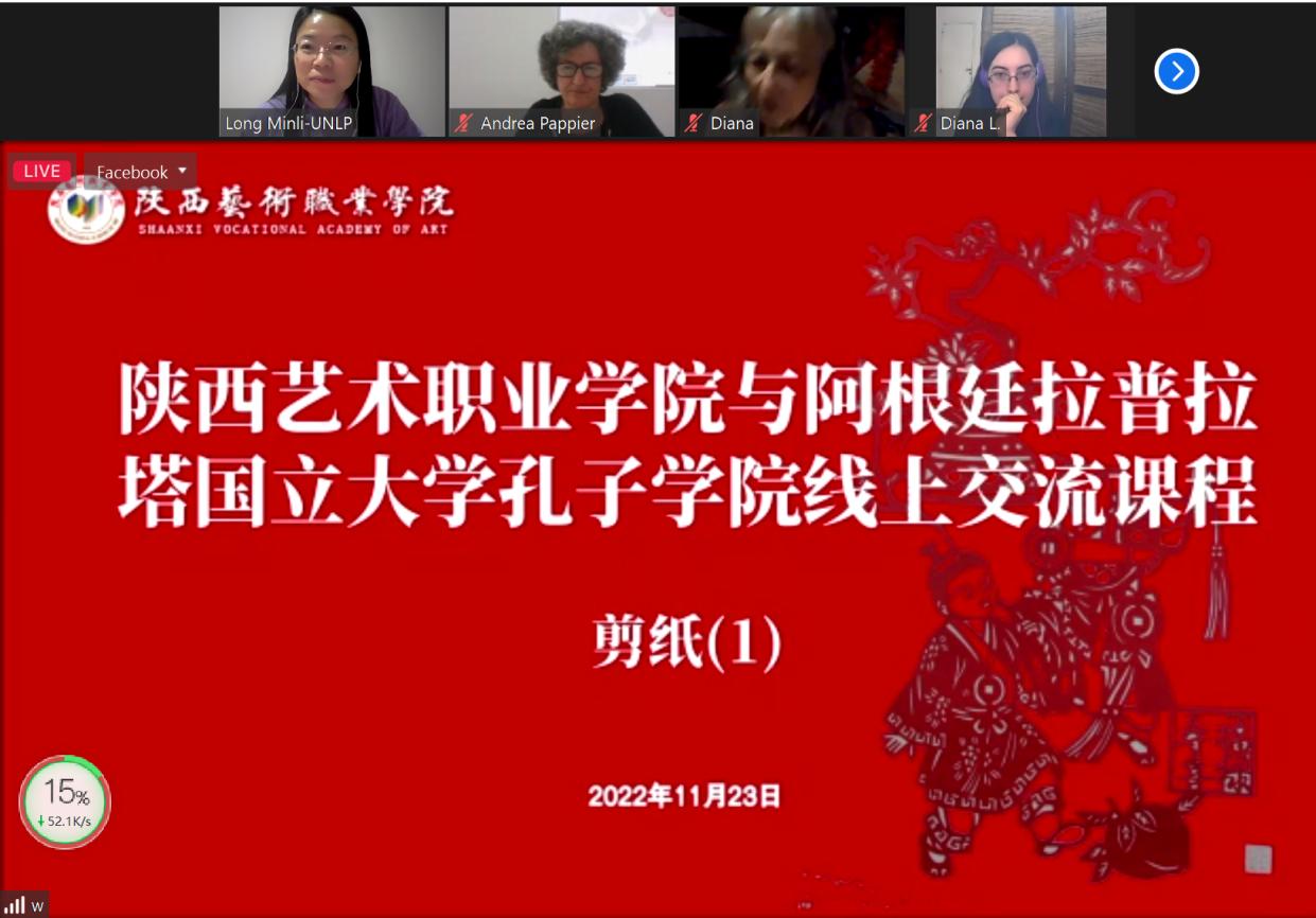 11月23日上午,陕西艺术职业学院与阿根廷拉普拉塔国立大学孔子学院首场线上交流课正式开讲。主讲人为我校客座教授、民俗文化学者、陕西省节庆文化促进会顾问左其诚。此次活动是由我校国际合作与交流处牵头组织,教务处、美术与设计学院和影视传媒学院共同承办的国际友好学校校际文化交流。阿根廷拉普拉塔国立大学孔子学院院长龙敏丽、阿根廷当地学者、墨西哥友人及孔子学院学生56位外国友人参加本次活动,一起感受了中国传统剪纸文化。对进一步促进中国文化推广与增进中阿友谊具有积极推动作用。