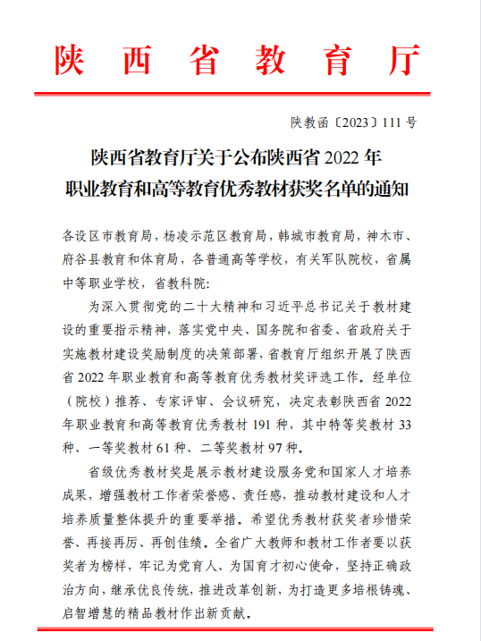 近日,自陕西省教育厅传来喜报,由我校教师薛莲主编的教材《陕西筝曲精品课程》获得陕西省2022年职业教育和高等教育优秀教二等奖。本次评选工作,是陕西省教育厅为深入贯彻党的二十大精神和习近平总书记关于教材建设的重要指示精神,落实党中央、国务院和省委、省政府关于实施教材建设奖励制度的决策部署而组织开展的。最终全省有191种教材获得该项殊荣,其中高职教育教育39种。