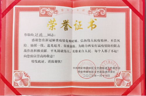西安碑林区文艺路街道办事处为工会邢娟老师颁发荣誉证书