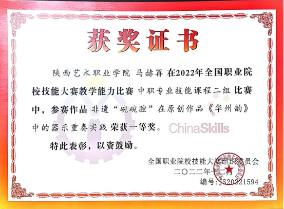 近日,2022年全国职业院校技能大赛教学能力比赛荣誉证书送达我校,由我校音乐学院胡锐、马赫苒、郝艺洁、王珂欣4位老师的参赛作品《非遗“碗碗腔”在原创作品<华州韵>中的器乐重奏实践 》喜获全国一等奖。