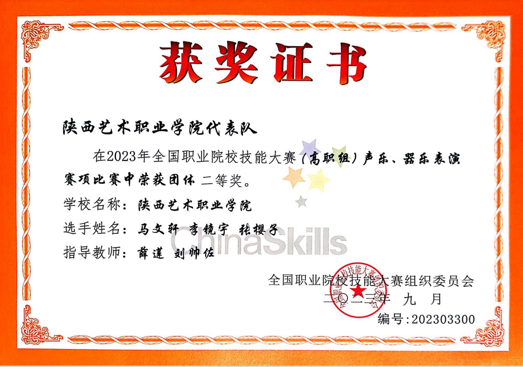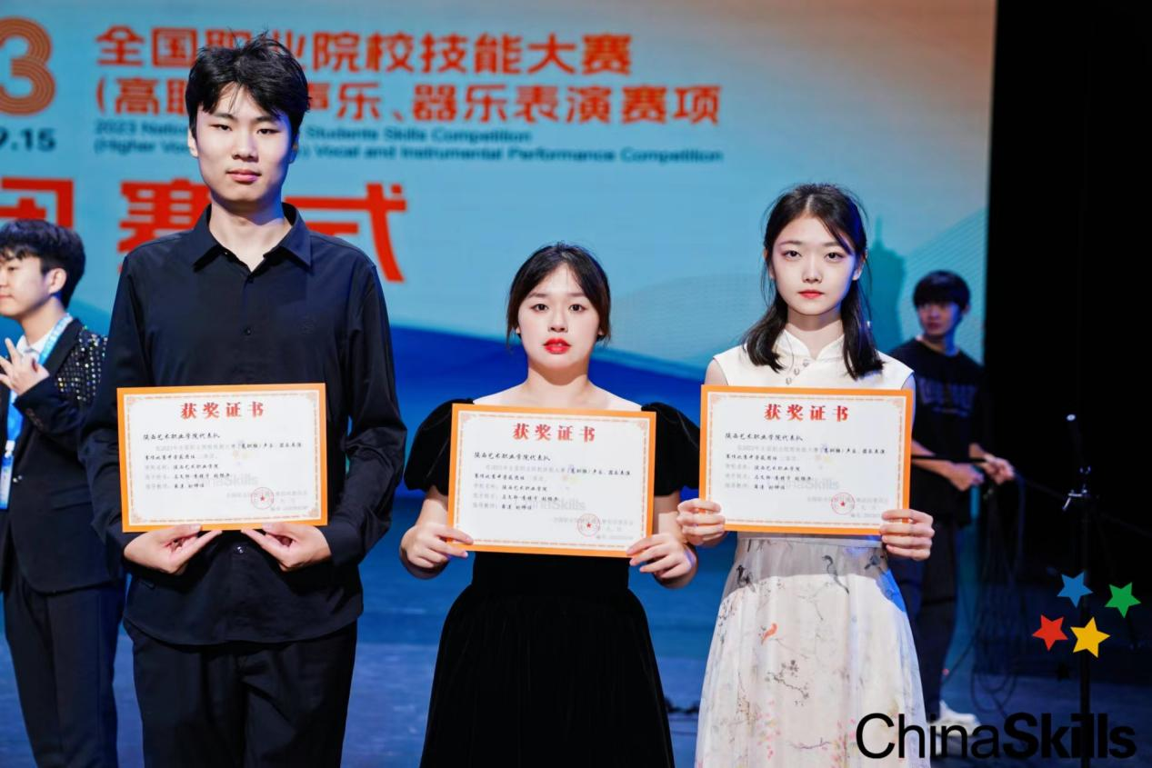 2023年9月10日—15日,2023年全国职业院校技能大赛(高职组)声乐、器乐表演赛项在杭州举办,来自全国的53支代表队、159名选手同台竞技。经过激烈角逐,陕西艺术职业学院代表队(参赛选手:马文轩、李镜宇、张樱子)荣获国赛“团体二等奖”。