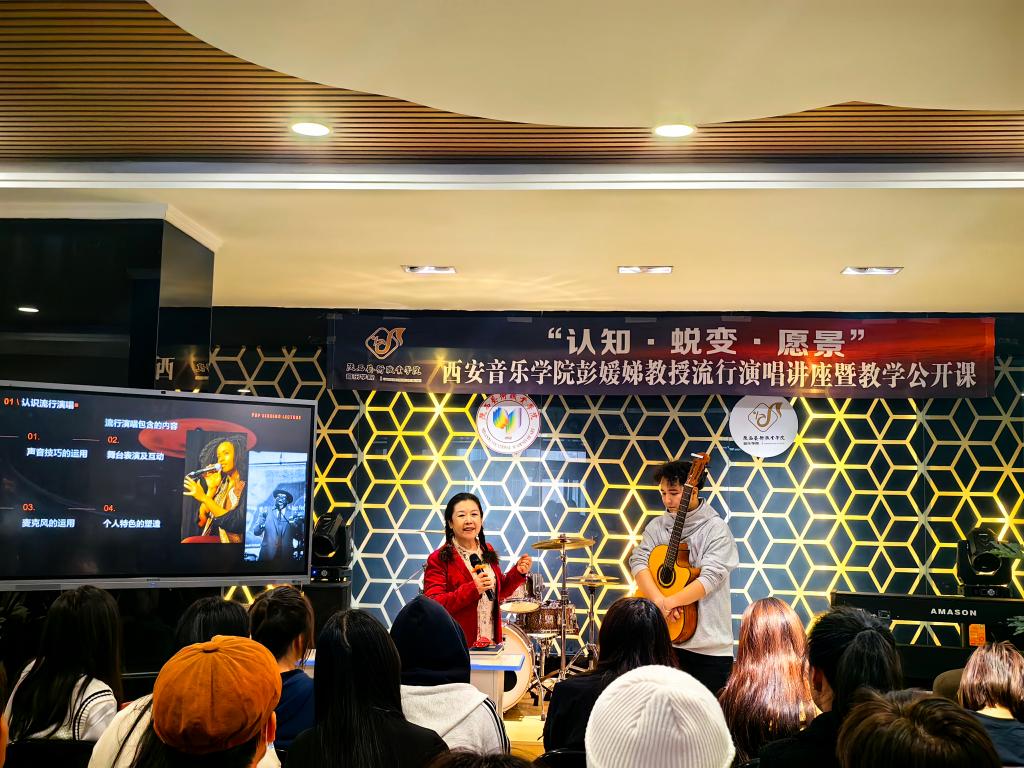 10月27日,由科研处、音乐学院主办的学术论“谈”系列讲座:“认知·蜕变·愿景”在长安校区乐工坊开讲,此次讲座特别邀请西安音乐学院彭媛娣教授为我校师生带来一场别开生面的流行演唱教学公开课。科研处处长李永春,音乐学院院长薛莲、副院长张婷婷、流行音乐教研室主任达三江及师生一同参加。