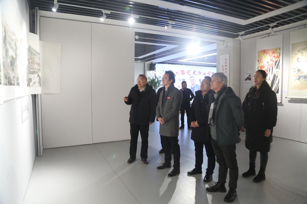 陕西艺术职业学院党委副书记、校长杨孝龙出席开幕式并致辞。陕西省美协副主席宋亚萍;陕西艺术职业学院党委副书记佘占宏;陕西山水画研究会主席西安交通大学城市学院艺术学院院长解安宁;陕西省林业厅巡视员王俊博;西安美术学院教授李百战;陕西书画研究会会长、陕西艺术职业学院教师、国家一级美术师肖幸海,陕西艺术职业学院美术与设计学院院长曹小劲,党总支书记张莉;陕西艺术职业学院党政办主任贺波;陕西艺术职业学院工会常务副主席赵旭红;土门工人文化宫主任侯鹏辉,副主任闫觅;陕西艺术职业学院美术与设计学院副院长王圣龙、王林奎,汉水传媒集团董事长刘呈友,陕西龙人书画院院长赵惠霞;陕西当代画院副院长、陕西省油画艺术研究会理事杨建武;西安市美术家协会理事、西安市鄠邑区美术家协会副主席石建利以及参会企业代表、美术与设计学院师生等参加开幕式。