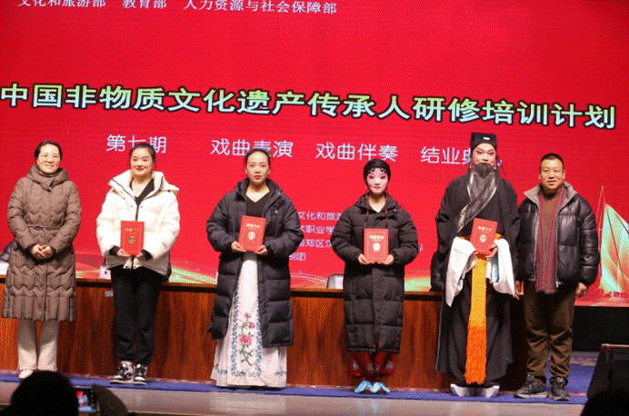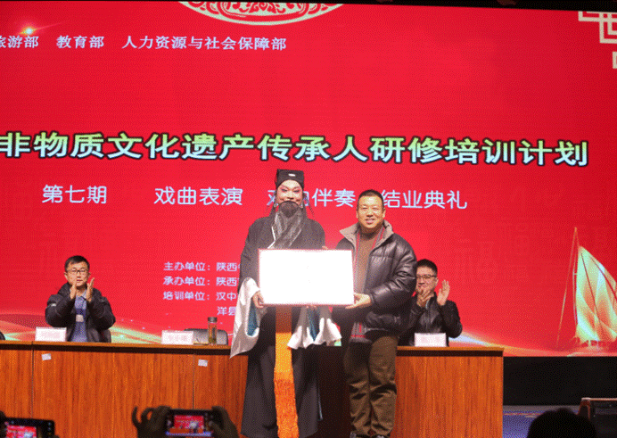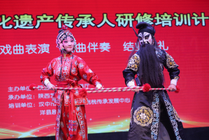 1月9日上午,由文化和旅游部、教育部、人力资源社会保障部共同实施,陕西省文化和旅游厅与陕西艺术职业学院联合举办的2023年度中国非遗传承人群研修培训计划第七期培训班结业典礼暨汇报演出在文艺南路校区小剧场隆重举行。陕西省文化和旅游厅非物质文化遗产处副处长周颖,我校戏曲学院院长李小雄,副院长张文宏、张冬,综合办公室主任刘治国出席结业典礼,并与来自汉中市洋县剧团、汉中市洋县剧团、南郑区汉调桄桄传承发展中心的50位学员以及学院部分师生一同观看了汇报演出。结业典礼仪式由张文宏主持。