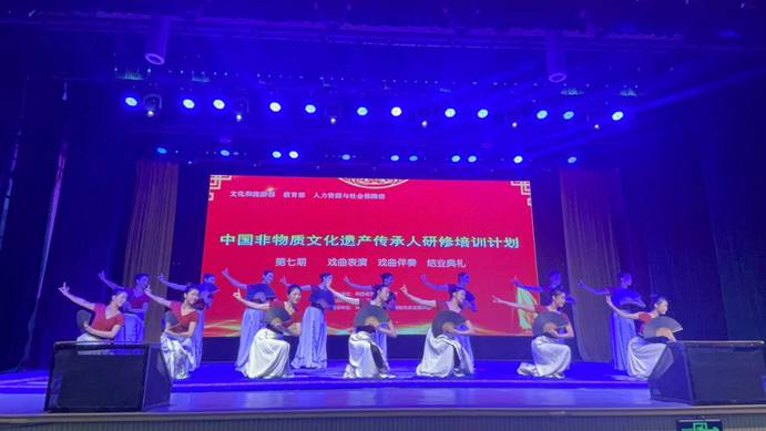 结业典礼结束后,学员们进行了专业汇报表演。学员们相继表演了秦腔《扈家庄》、《打焦赞》、《藏舟》等优秀秦腔折子戏以及相关身段表演,精彩的表演赢得了现场观众阵阵掌声和好评。通过演出,检验了一个月来的研培效果,丰富了学员们的舞台经验,同时为本次戏剧类中国非遗传承人培训第七期研培计划画上了圆满句号。