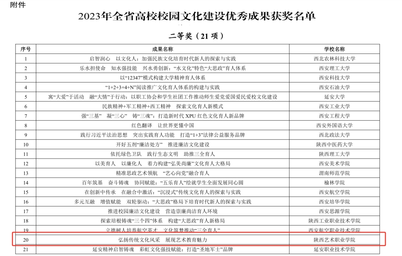 近日,《中共陕西省委教育工委办公室关于公布2023年全省高校校园文化建设优秀成果评选结果的通知》公布陕西艺术职业学院申报的《弘扬传统文化风采 展现艺术教育魅力》荣获全省高校校园文化建设优秀成果二等奖。
