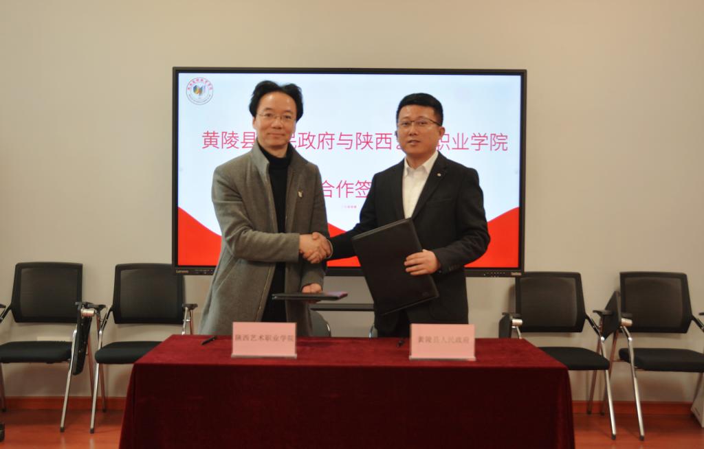 在双方领导和与会人员的共同见证下,陕西艺术职业学院校长杨孝龙与黄陵县人民政府副县长殷小彤签订了合作框架协议书。