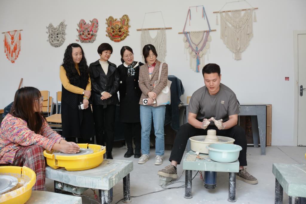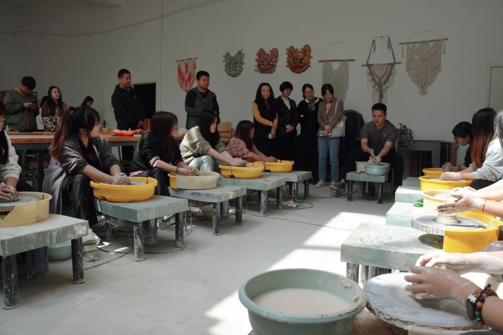 董雪、吕华一行先后来到长安校区参观校史图片展,深入了解学校陶艺、玉雕、篆刻等课程的授课情况与非遗作品,在文艺路校区,观摩了戏曲唱念、剧目等课程的教学,并了解古琴、扬琴、古筝等教学情况。