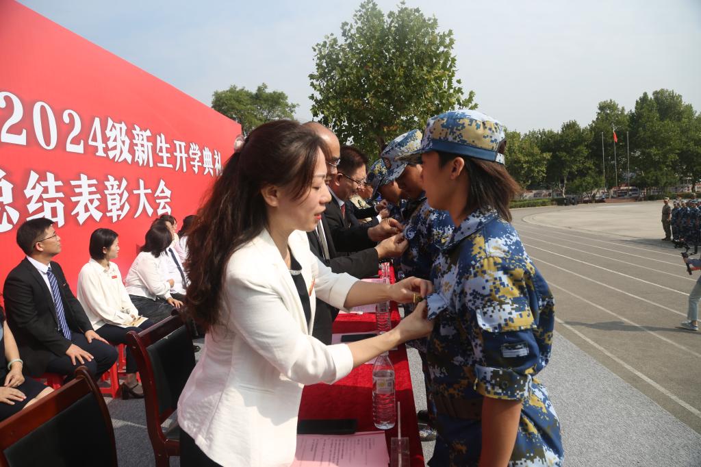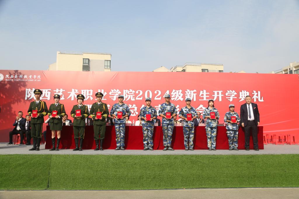 马琳了宣读陕西艺术职业学院关于2024级学生军训优秀连队、优秀学员的表彰决定。杨孝龙代表学校为承训基地赠送锦旗。郑毅刚、任玉银、邵鸣分别为优秀连队、优秀学员颁奖。全体校领导为2024级新生代表佩戴校徽。