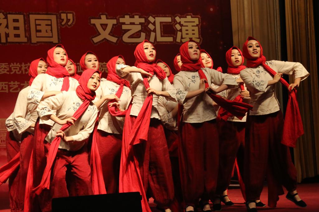 风雨兼程七十载,不忘初心铸辉煌。“风在吼,马在叫,黄河在咆哮,黄河在咆哮……”随着《黄河大合唱》慷慨激昂的旋律,演出正式拉开帷幕。舞蹈系学生群舞《黄河大合唱之保卫黄河》在铿锵有力的节奏中,用满腔激情,再现中华儿女不屈不挠,保卫祖国的坚定信念。影视系排演的情景剧《安吴青训班》以学员们讨论毕业去向切入,在共赴延安抗战救国中展现了中国青年的使命与担当。常艳妮老师演唱的陕北民歌《东方红》高亢婉转、清澈动听,深情歌颂革命领袖与共产党人为人民谋幸福、为中华民族谋复兴的崇高情怀。学院民族乐团演奏的《塔吉克》与《翻身道情》,以欢快跳跃的旋律,热情多变的节奏,表现了塔吉克族与广大贫苦人民在共产党领导下翻身作主,庆祝胜利的欢乐场面。戏曲系李锦航老师演唱的《洪湖赤卫队》选段《秋风吹》,唱腔抑扬顿挫,秦声悠扬,正义凛然,观众掌声不断。独舞《映山红》、独唱《红旗飘飘》、群舞《盼》、配乐诗朗诵《我爱你中国》精彩纷呈,引人入胜。“我们的热望,从百年风雨传来;我们的梦想,从没像今天这么精彩……伟大的复兴指日可待,中国进入新时代。”歌舞《中国进入新时代》以恢宏的气势,壮丽的阵容将演出推向高潮,再现中国人民阔步新时代的豪迈与自信。最后,演出在全体演员深情演唱《我和我的祖国》中缓缓落幕。