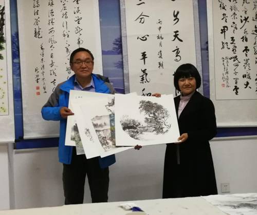 | 院党委副书记、副院长肖幸海(左)向华州区文化馆馆长薛瑞(右)赠送渭华起义题材美术作品 |