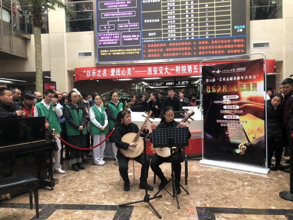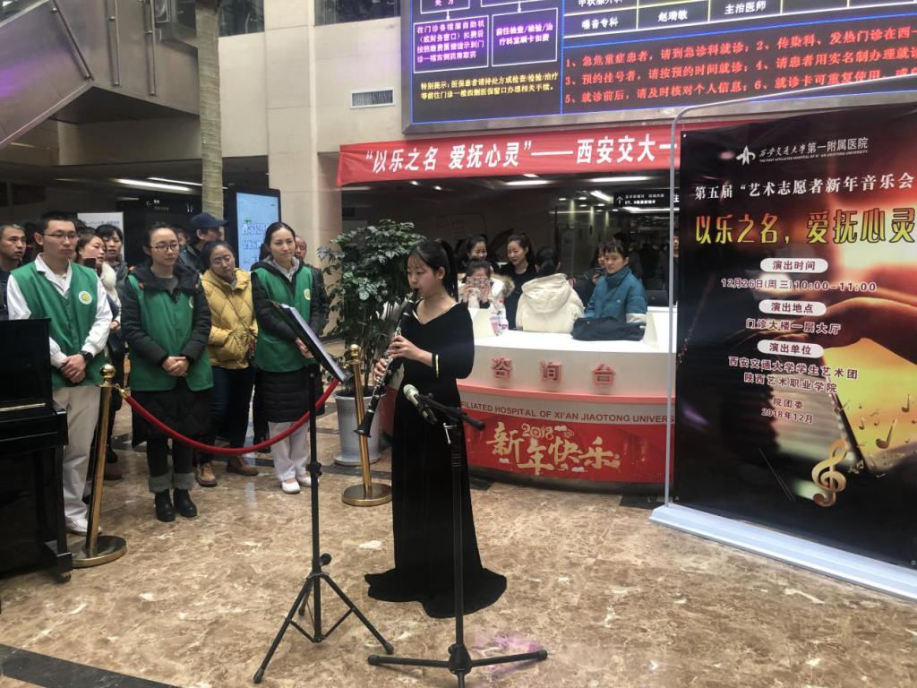 上午10时许,名为“以乐之名•爱抚心灵”西安交大一附院第五届志愿者新年音乐会在交大一附院门诊一层大厅正式拉开帷幕。此次演出,由我院志愿者以及西安交通大学学生艺术团学生共同完成。为了向听众献上不同风格和表现形式的优美音乐,演员们准备了丰富多彩的节目,不仅有萨克斯、单簧管、钢琴等乐器演奏的西方经典音乐,更有民族气息浓郁的中阮重奏《天地之间》、二胡齐奏《赛马》等中华名曲。美好的旋律、温暖的关怀,使许多行色匆匆穿梭于门诊大厅的就医者被琴声所吸引,放慢了脚步,纷纷聚拢过来,感受音乐带来的心灵抚慰。